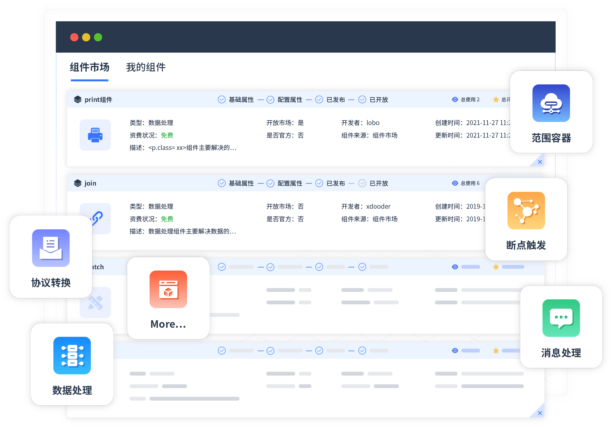 针对集成场景,,,GOPAY钱包提供组件市场,,,,例如协议转换、、、、消息处理、、、、文件操作等。。。除平台提供的组件外,,客户可以自定义所需组件。。。。