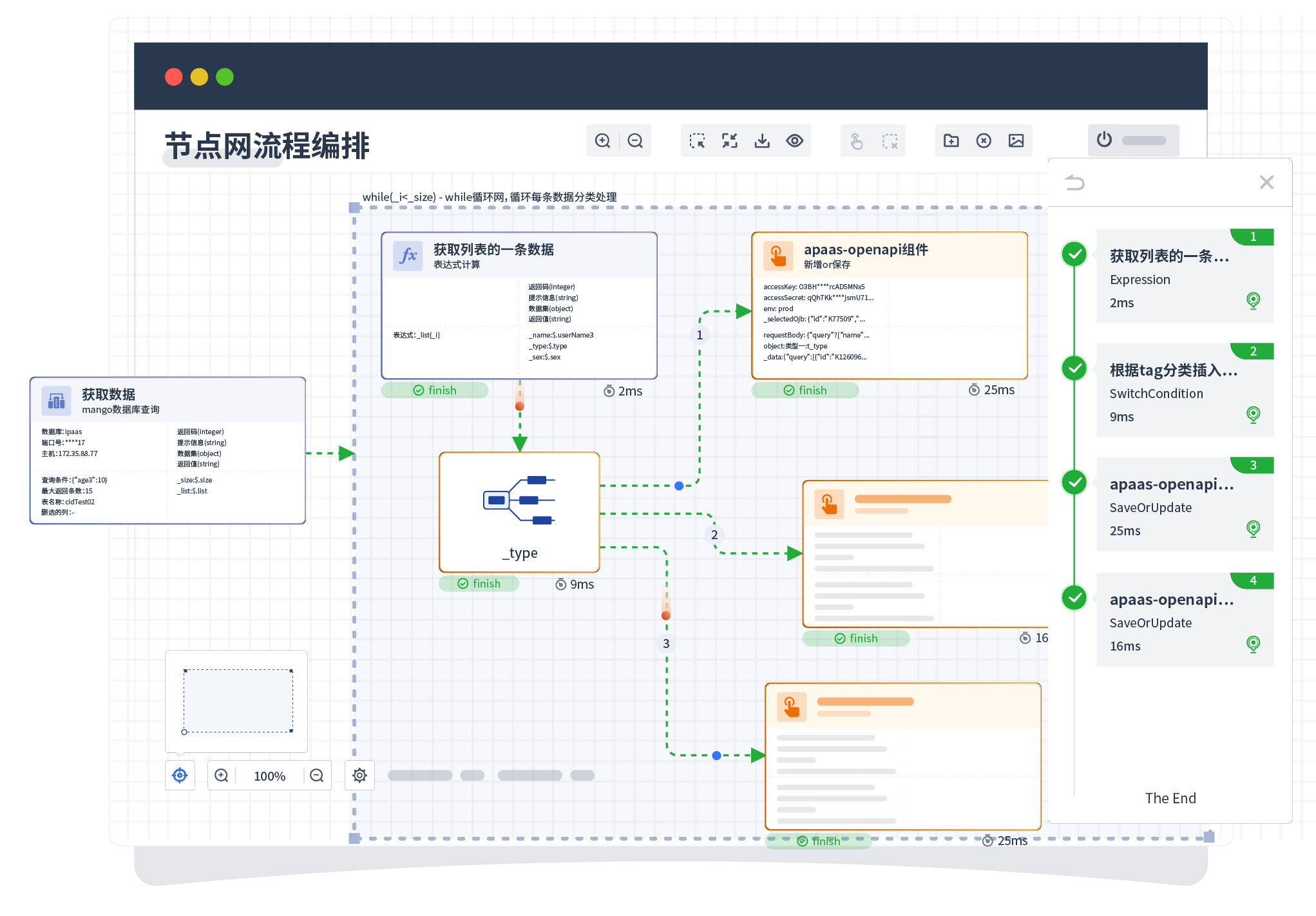 针对集成场景,,,组件定义后支持进行流程编制,,,不同于传统代码方式,,,,通过图形化展示,,,,支持在线调试、、、、日志查看和运行回放。。。